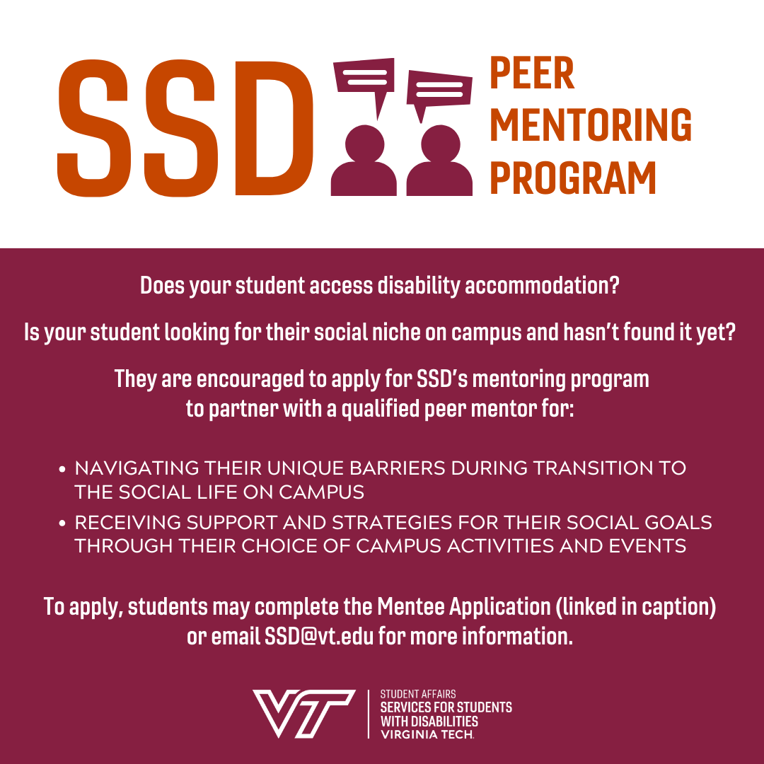 Does your student have current disability accommodations with Virginia Tech Services for Students with Disabilities (SSD)? Encourage them to join the peer mentor program!